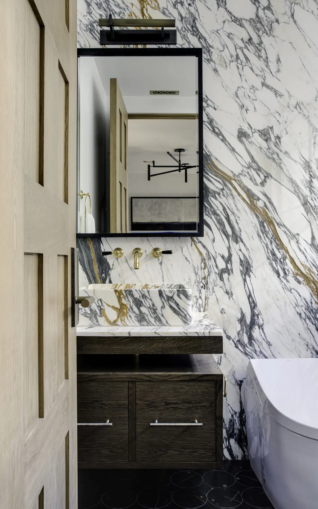 For the main Powder Room, Bryen opted for Samuel Heath’s Landmark LMK Industrial Basin Mixer in City Bronze, selected for its ability to anchor the space visually against the high-drama backdrop of Calacatta Monet marble. The specification features a unique angled lever, selected without a backplate for a pared-back, architectural finish. “We needed a fixture that would be able to hold its own against the slab and light fixture,” explains Bryen. “The LMK Industrial faucet worked amazingly. We love the attention to detail and the sophisticated elements.” Walls are finished in Venetian plaster by Applied Plastering, while the lighting, sourced from Circa Lighting, casts a soft, ambient glow across the deep veining of the stone.
