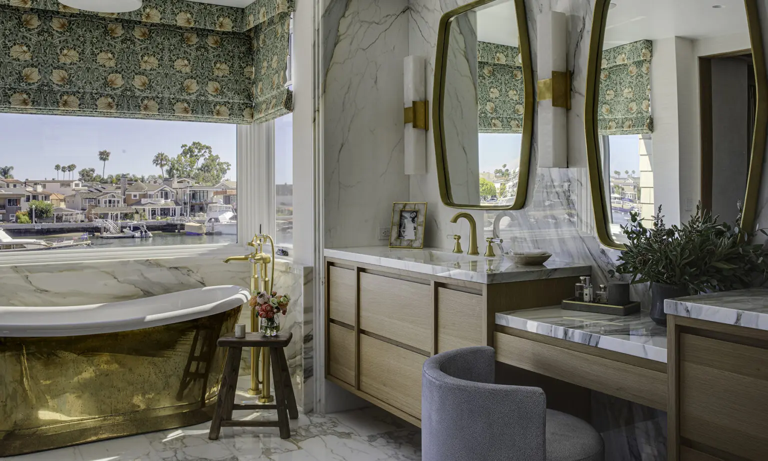 The room is clad floor-to-ceiling in Calacatta Borghini stone, setting a serene, monolithic tone. Visual Comfort lighting, Morris & Co blinds, and bespoke detailing balance the room’s vibrant composition, creating a haven of indulgence and design precision.
