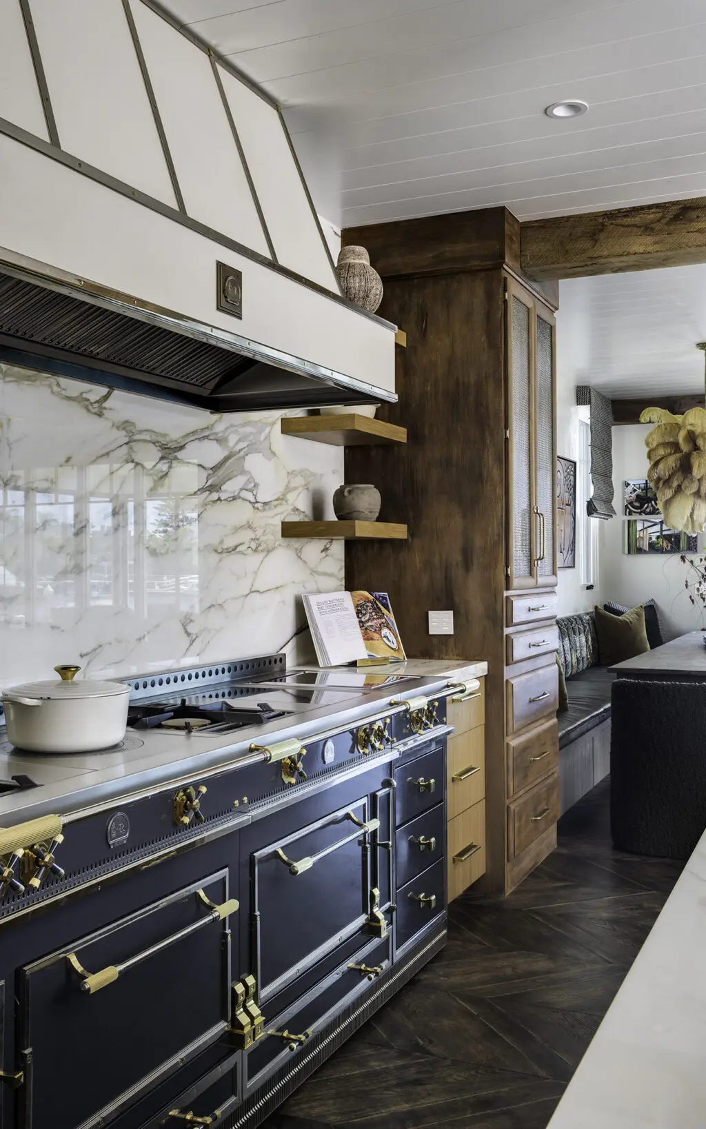 In the kitchen, the focal point is an astonishing Art Deco-inspired oven handcrafted by La Cornue, set in dramatic contrast to a white marble backsplash and waterfall island. Customised Pendant lights from The Urban Electric Company and bespoke cabinetry were tailored to complete an expressive effect. “Our client is not afraid to experiment with colour and texture, and that allowed us to be creative with every detail,” says Bryen. “We put together an elevated, luxury feel while incorporating vibrant, personal touches.”