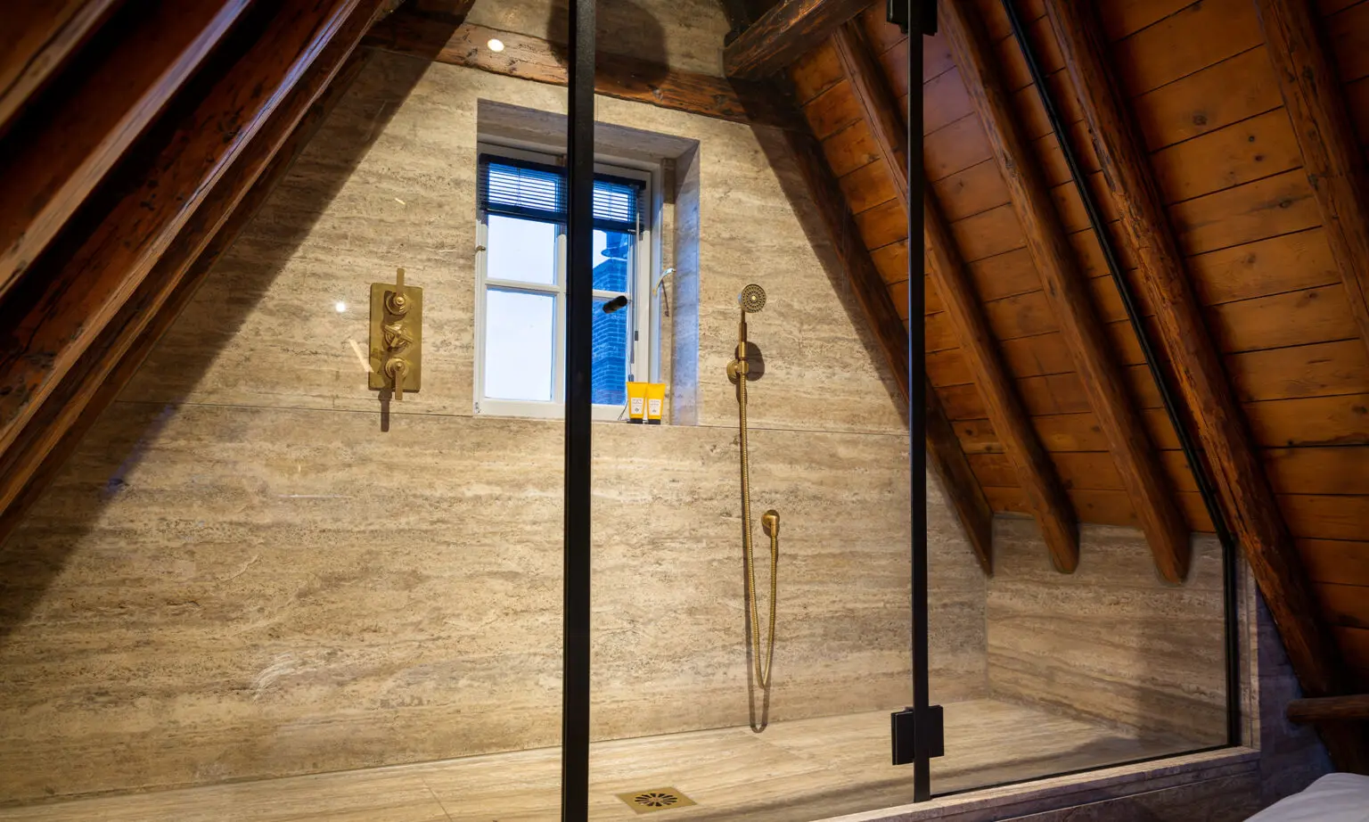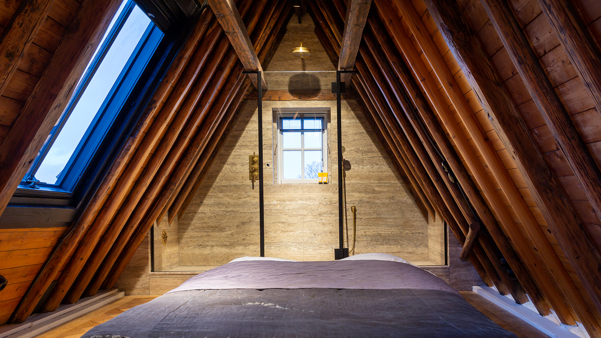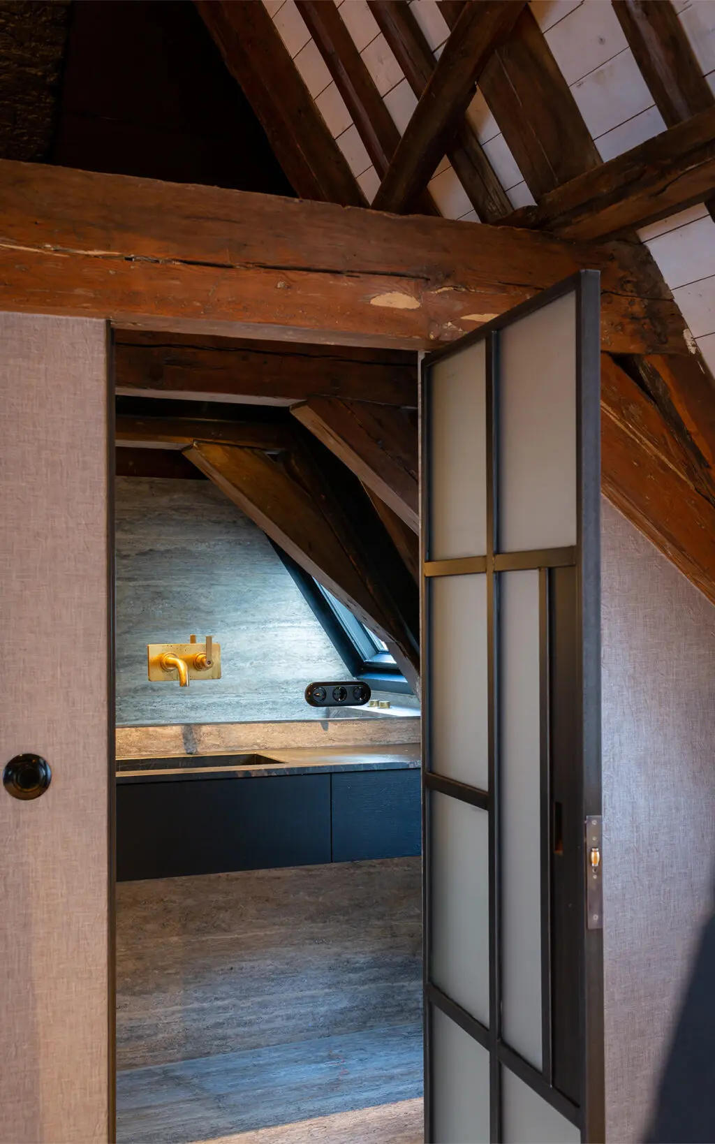 The transcendence of ‘classic industrial’ interiors is perhaps most prominent in the unconventional bedroom-turned-bathroom – a fine example of innovative Dutch design. Here, an arch-shaped room housing only a bed makes way to a walk-in shower, perfectly nestled beneath the beams of the ceiling. The addition of simplistic Landmark Pure concealed thermostatic shower fixtures create a bold statement against light travertine marble, while a golden Urban Brass finish gently elevates an earthy colour scheme. The bathroom encapsulates the premise of the brief by offering the luxuries of modern living while complementing the classic architecture of Keizergracht.