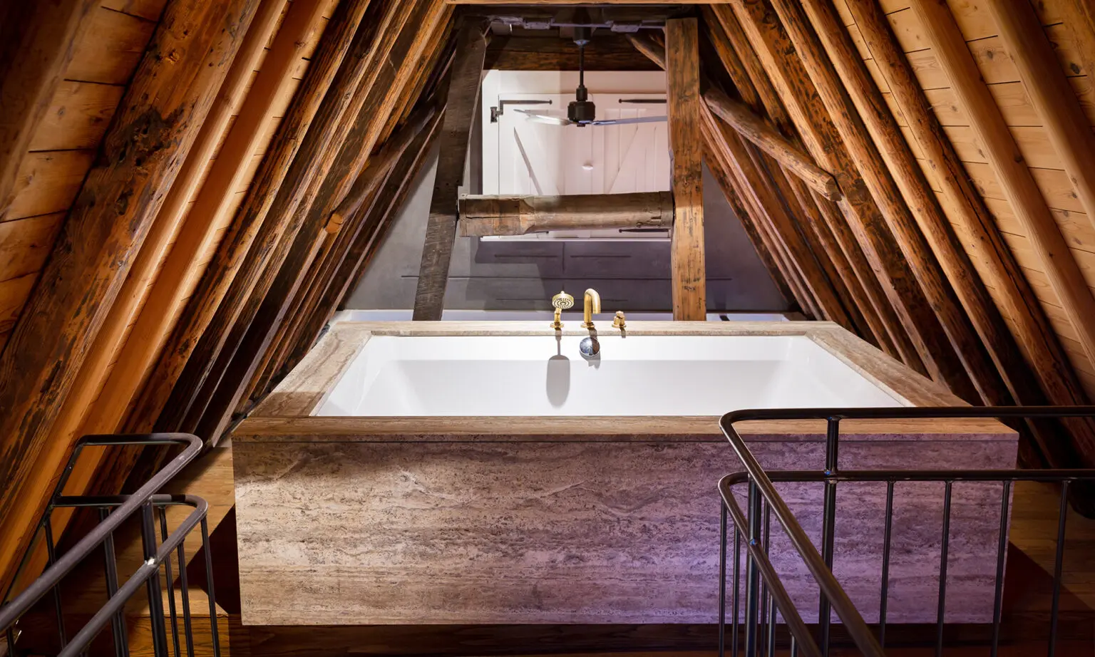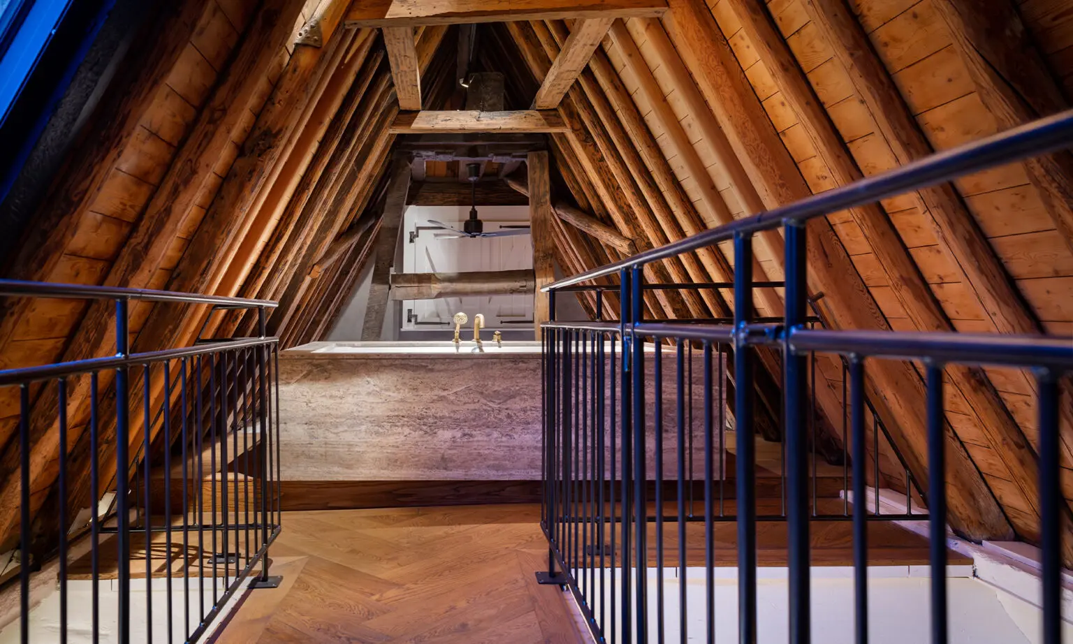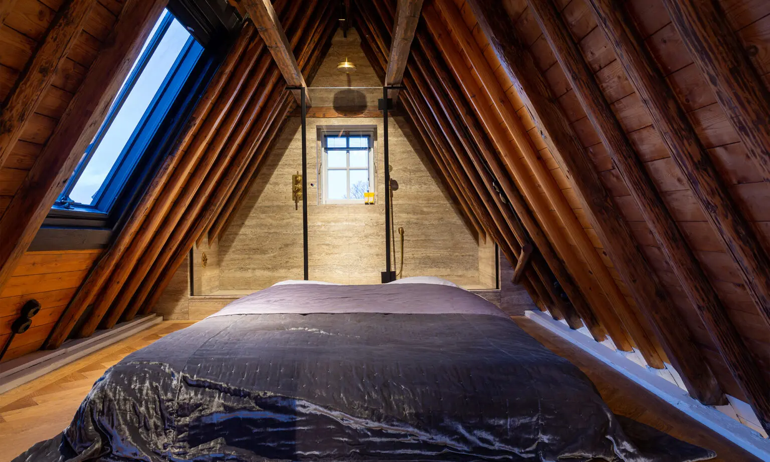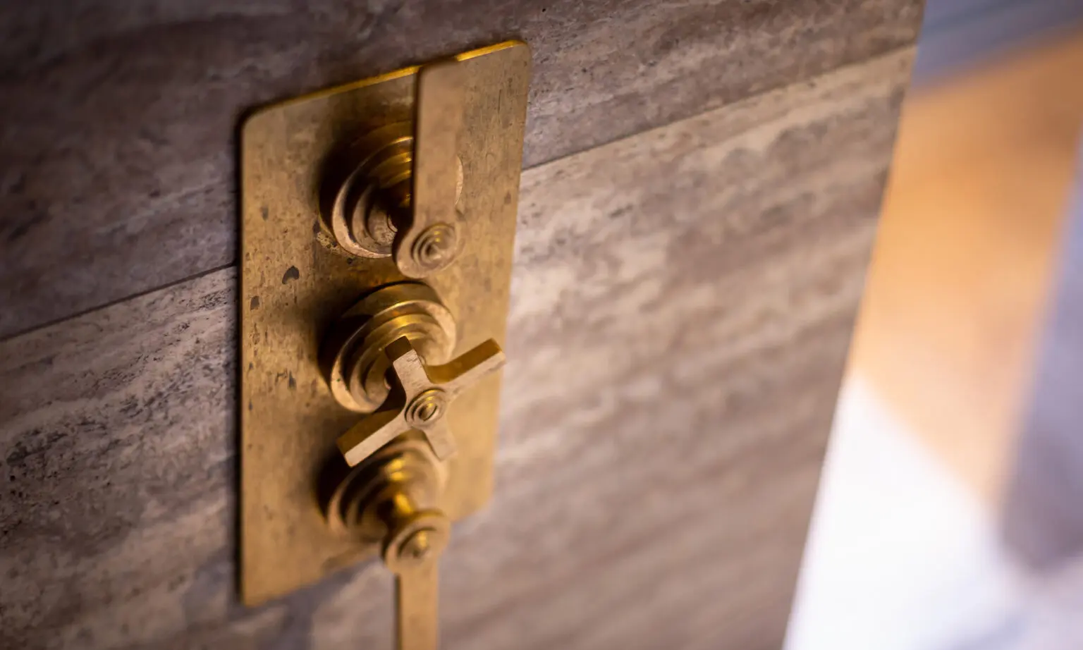 The transcendence of ‘classic industrial’ interiors is perhaps most prominent in the unconventional bedroom-turned-bathroom – a fine example of innovative Dutch design. Here, an arch-shaped room housing only a bed makes way to a walk-in shower, perfectly nestled beneath the beams of the ceiling. The addition of simplistic Landmark Pure concealed thermostatic shower fixtures create a bold statement against light travertine marble, while a golden Urban Brass finish gently elevates an earthy colour scheme. The bathroom encapsulates the premise of the brief by offering the luxuries of modern living while complementing the classic architecture of Keizergracht.