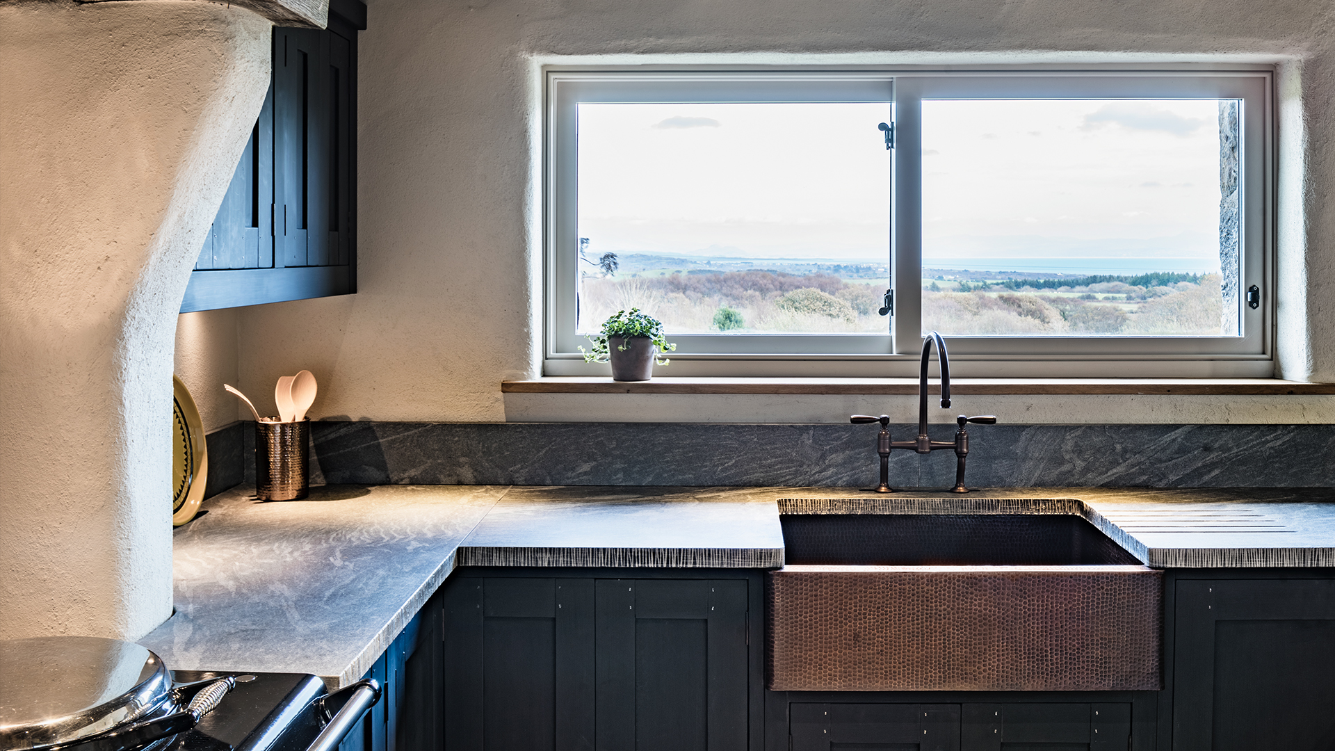 The kitchen was designed in a modern farmhouse style by mixing the old with the new. Polished concrete floors and exposed grain timber units painted in bold black interpret traditional materials in a new, sleek fashion. Limestone counter tops were paired with a Fairfield kitchen tap by Samuel Heath, where its classic styling helps to blend both themes. A luxurious feel was achieved by specifying these high-quality fittings for kitchen touchpoints, whilst contemporary additions including intelligent lighting and the latest music technology incorporated modern living standards into the space.