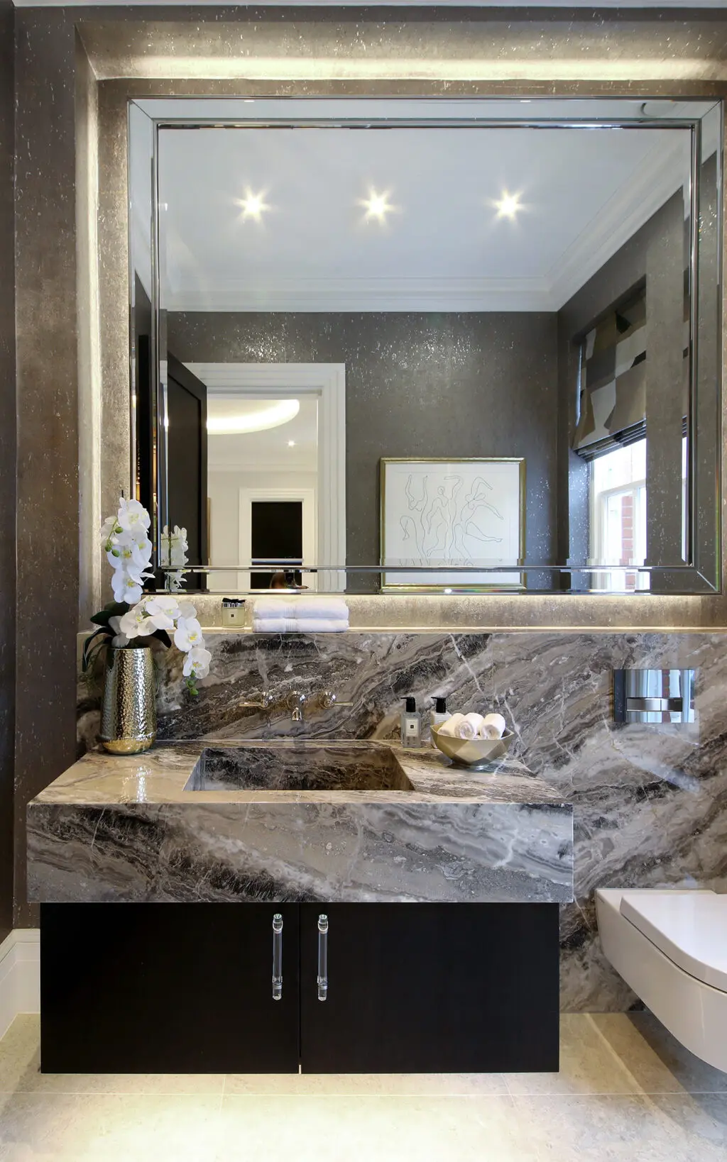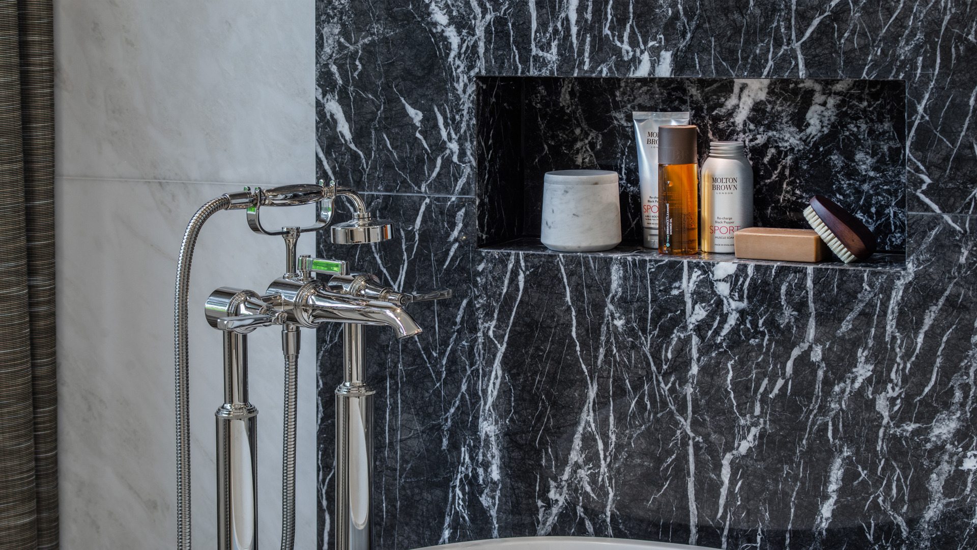 The interior architecture team created a bespoke marble vanity unit featuring a striking marble that runs behind the taps, for a seamless design. Polished Nickel brassware adds a subtle warmth to the marble, while a bespoke illuminated framed mirror above the feature wall lights and textured wallpaper to add a luxurious feel to the space.