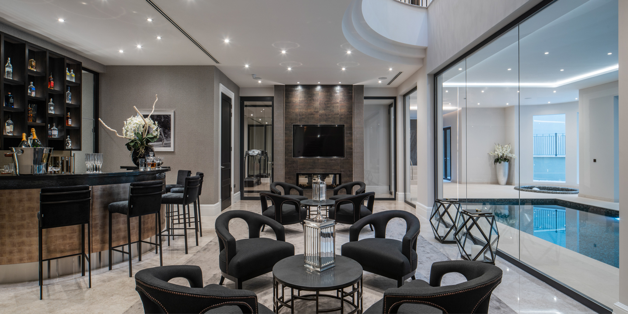 An expansive 14,000 sq. ft build area provided ample space to reconfigure the perfect layout for functional yet luxurious family living. Six bedrooms, nine bathrooms and four cloakrooms were all designed to include their own expansive, open plan interiors for flexible use. The additional entertaining rooms, hidden wine room and indoor leisure suite – complete with a swimming pool and spa facilities – ensured that the home could benefit from all of the luxuries that a family could want.