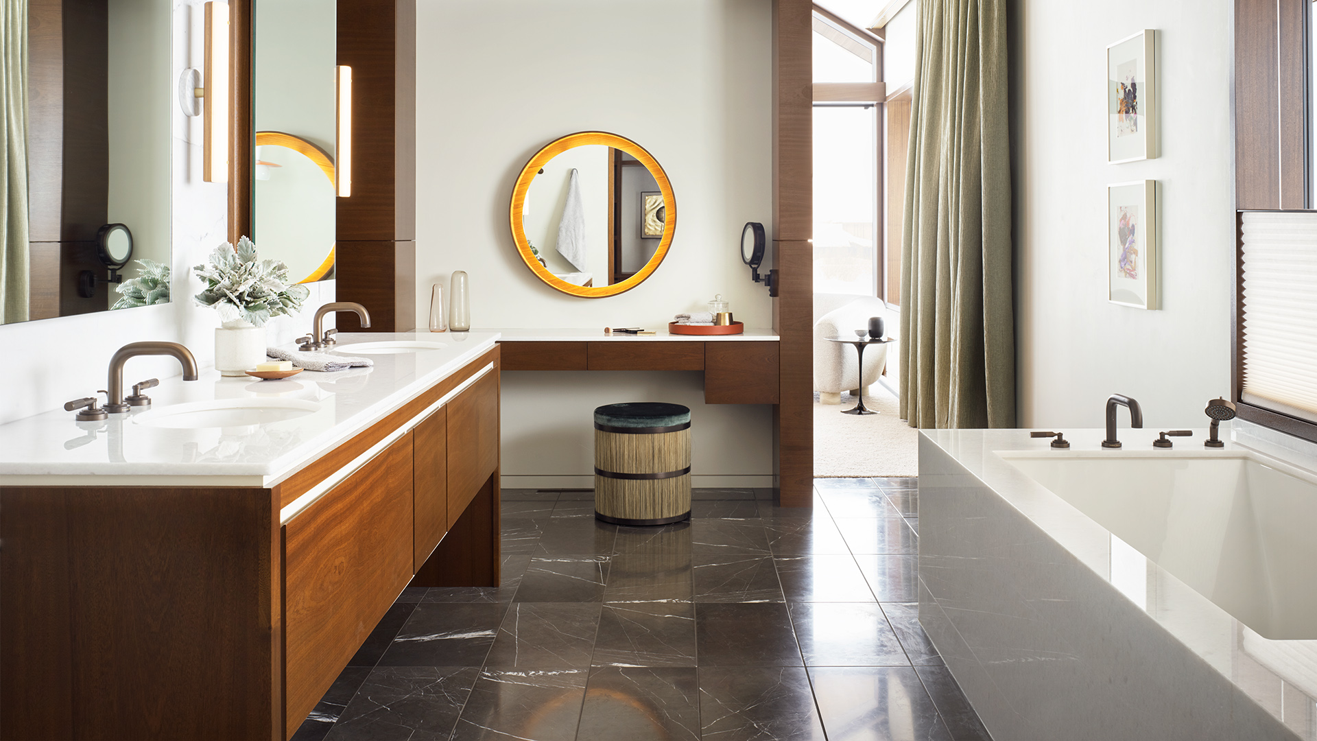 The awe-inspiring detail of Lone Pine pays homage to artisanal influence, with a running theme of ironmongery that enhances the merger of form and function. This includes a steel and leather entry door and a steel stair railing with leather strapping. Meanwhile, the upper master bathroom is fitted with traditional brass accessories by Samuel heath. The client selected our Landmark Industrial collection of brass basin faucets, bath and shower fixtures and a wall-mounted mirror. This collection has a Bauhaus influence, which offers a new artistic flair to the space. A City Bronze finish also complements the warm & decadent palette of surrounding wooden cabinetry and marble flooring.