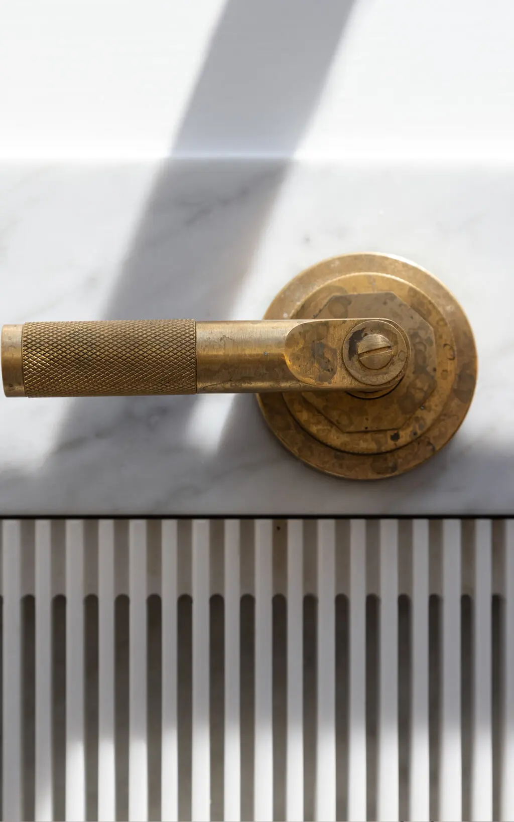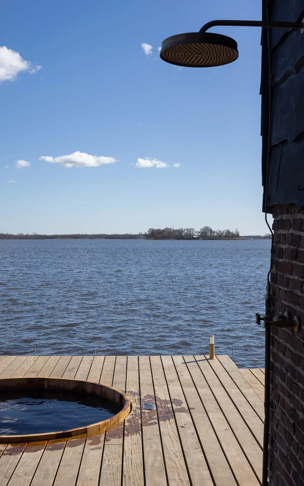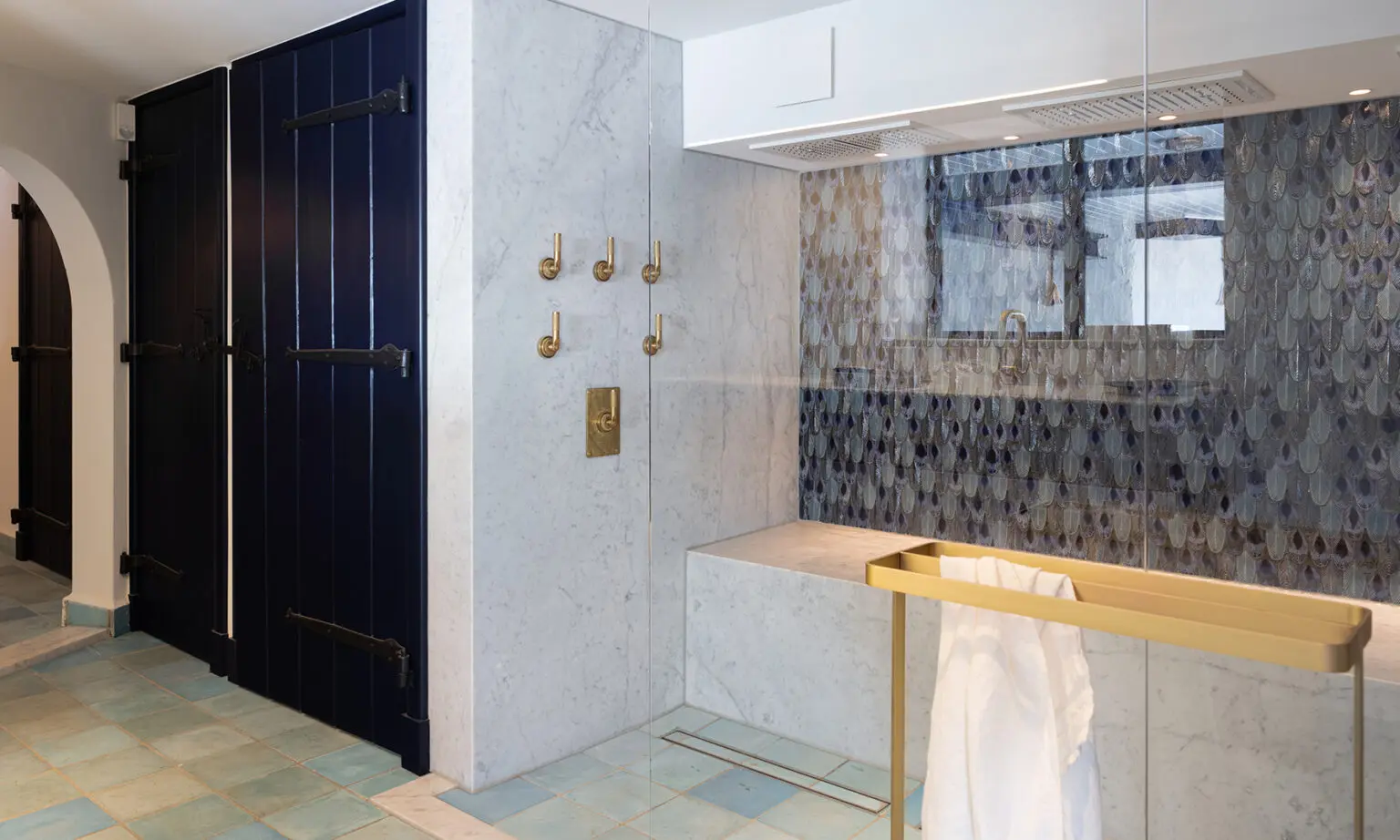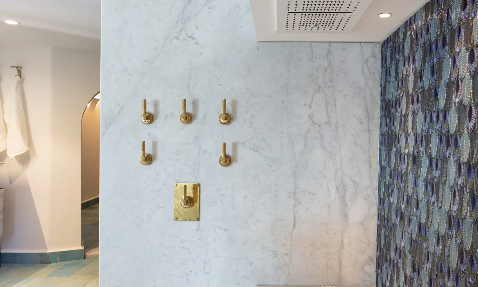 For the all-important finer details, Sjartec selected Landmark Industrial brassware to create multiple facilities with spa-like functionality. A jacuzzi and shower situated outside overlooks the scenic lakes, while an inside shower installation created by a series of valve controls provide the ultimate in relaxation. Basin, bath and shower fixtures selected in an Urban Brass finish create the effect of gold ‘jewellery’ within a palette of white and blue and an additional patina adopted over time completes the space with a rustic, relaxed feel.
