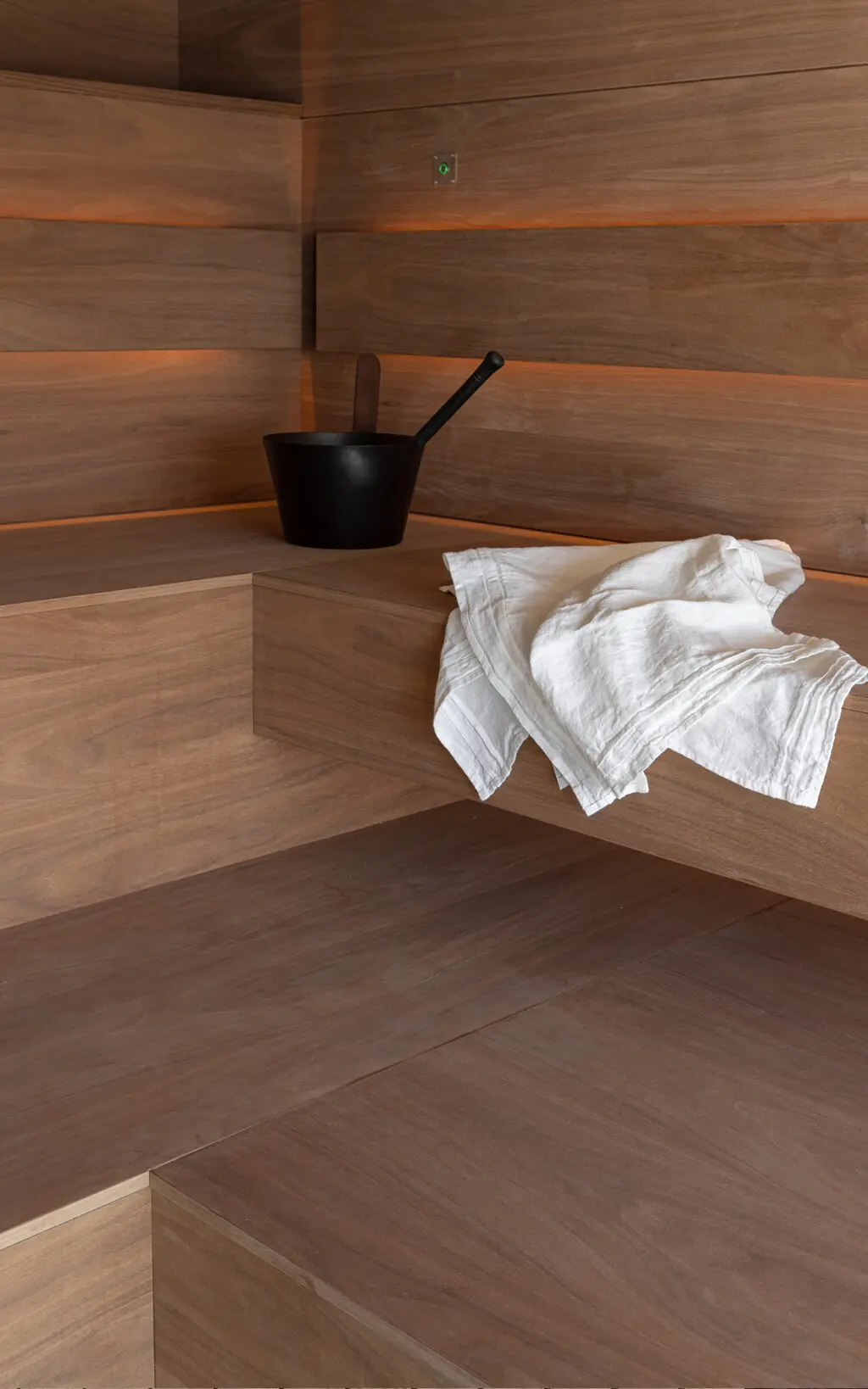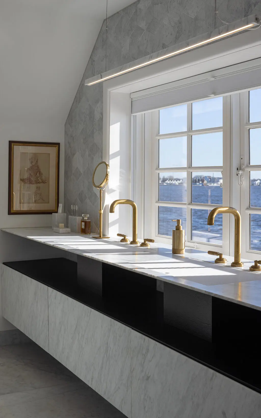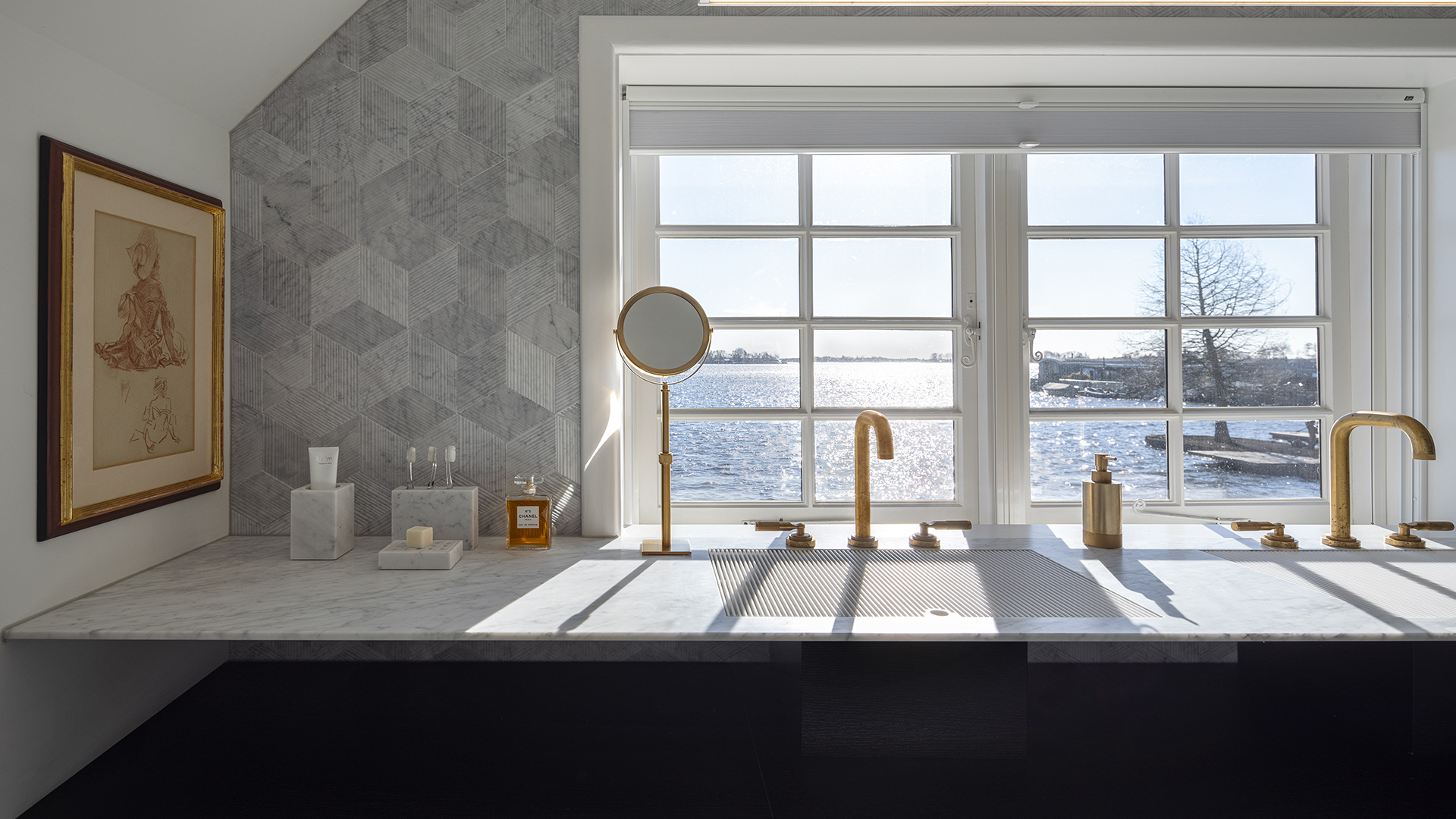 Where do you begin to design multiple bathrooms of a family villa that honour this natural monument? High-end bathroom designer Sjartec prioritise ‘wellness’ above all else, putting their trademark “relaxed feel with a touch of luxury” at the forefront of the brief. The studio then looked to the natural surroundings to achieve “colour and a calm appearance”, drawing inspiration from the bright sky (a white marble basin & shower), the expanse of blue water (a BottegaNove iridescent tile mosaic) and timber decking of the harbour (a custom-made oak panel sauna).