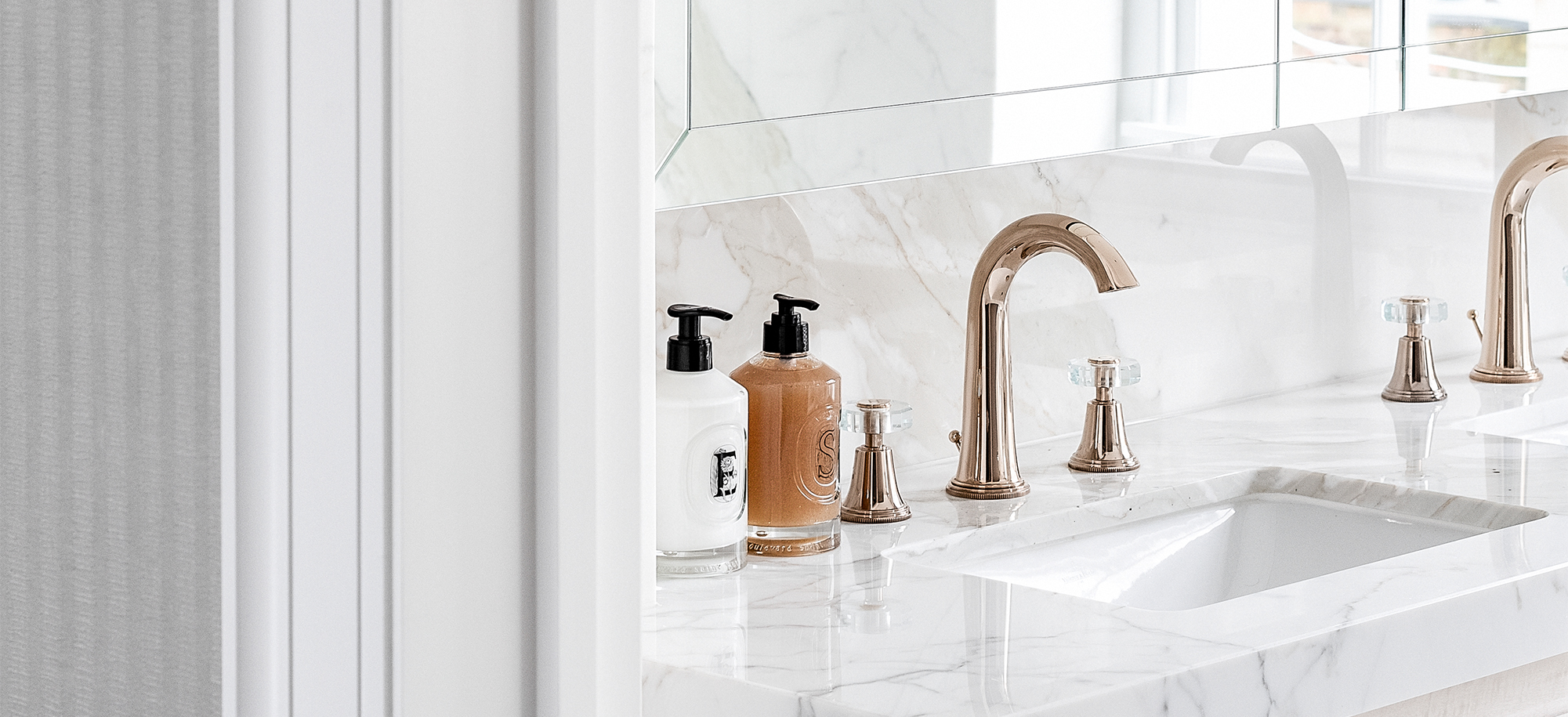 An undeniable sense of style continues within all of the bathroom interiors, which perform as proud entities within the theme of timeless glamour. A ground floor cloakroom features Cararra marble that is artfully book-matched, to find itself at a crossroads of where contemporary meets classic. A Style Moderne basin filler in Polished Nickel with Luxe crystal handles sits proudly in front of a Venetian style mirror, complete with rolled hand towels and designer soaps to create a chic cloakroom experience.