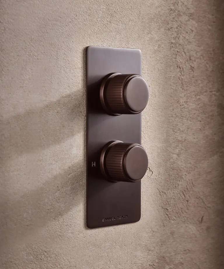 The Oriel family of Forme controls boasts four distinct identities to offer further variation for bespoke projects. Groove and Bay roundels feature sharp fluted and geometric engravings for intriguing pattern and tactility. The Tab roundel is a soft rendition of modernist design, with smooth tab detailing that enhances fluidity alongside the elegantly curved silhouettes of matching spouts. Pyramid embodies decadence with a series of precisely milled engravings, encouraging light and shadows to interact differently with each metallic finish