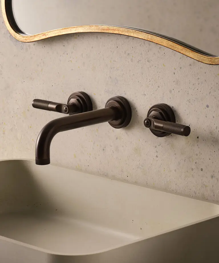 The LMK Industrial collection, with its precision knurling and architectural weight, becomes the unifying detail – appearing as basin taps, concealed showers, and a striking bath and shower mixer in the master suite. Each piece is placed deliberately, working in quiet concert with its backdrop: polished stone, brushed metal, or shadowed light.