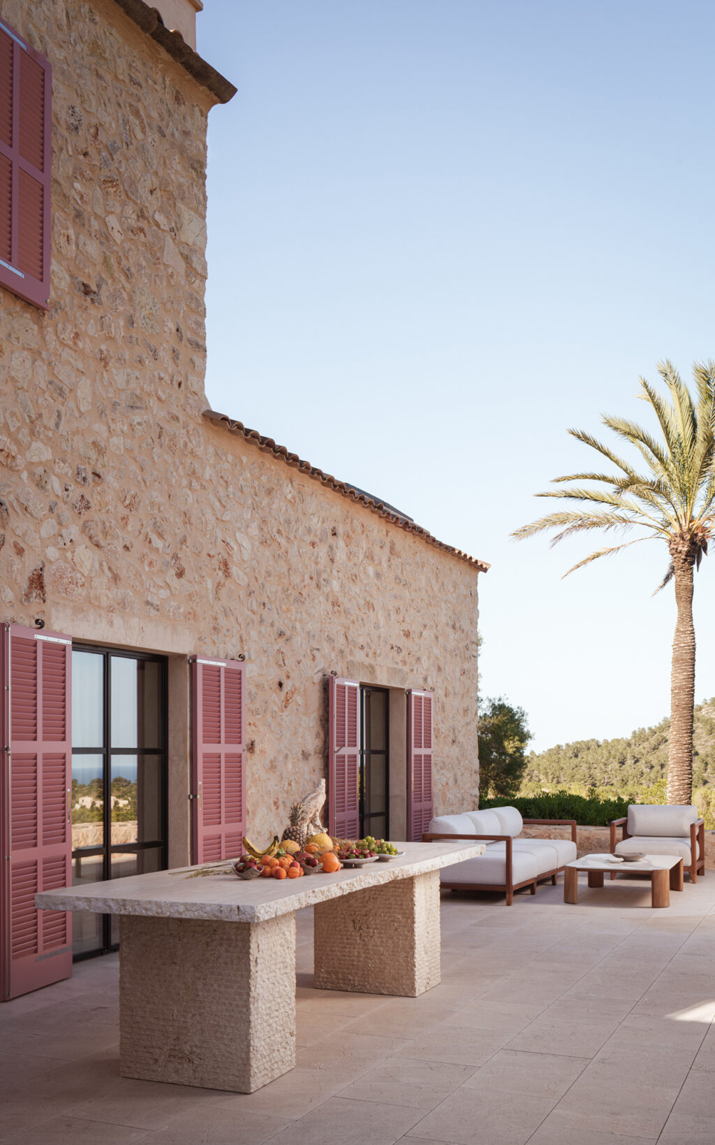 Pieces throughout have been sourced with emotion and memory in mind. “We approached it as one might curate an exhibition – thoughtfully, sensitively, and with reverence for both provenance and purpose,” says Soliman. She worked closely with Mallorcan artisans to integrate pottery, metalwork and joinery that feel inherently part of the building’s DNA. Even bespoke elements, such as the orange stone bedside cabinets from Italian furniture makers, carry a sense of material honesty, quietly echoing the hues of the island.