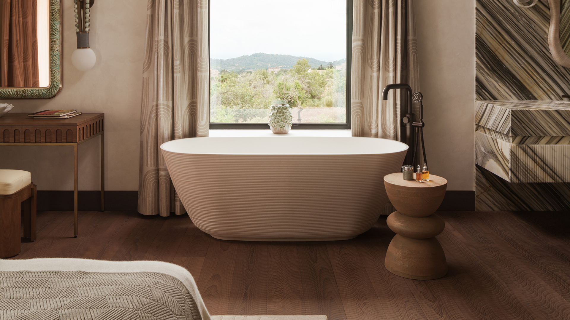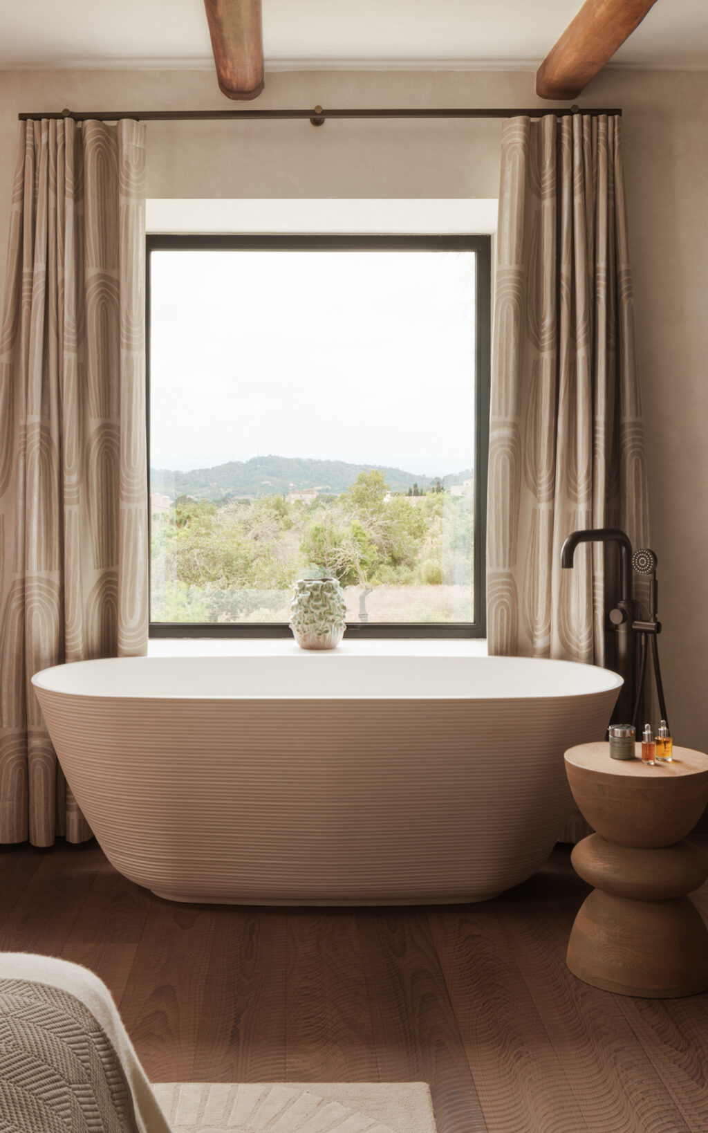The master ensuite is quietly theatrical: a cream-and-black striped stone vanity at the entrance introduces rhythm and geometry, before the room opens into warm beige walls, accented by finca-inspired ceiling beams, and a bathing area that feels connected to the island beyond. A freestanding Ashton & Bentley bath sits in front of a large window, the floor beneath catching the movement of light. Here, as throughout, it is the choice of brassware that completes each composition, with every bathroom fitted with pieces from Samuel Heath’s LMK Industrial collection in City Bronze.