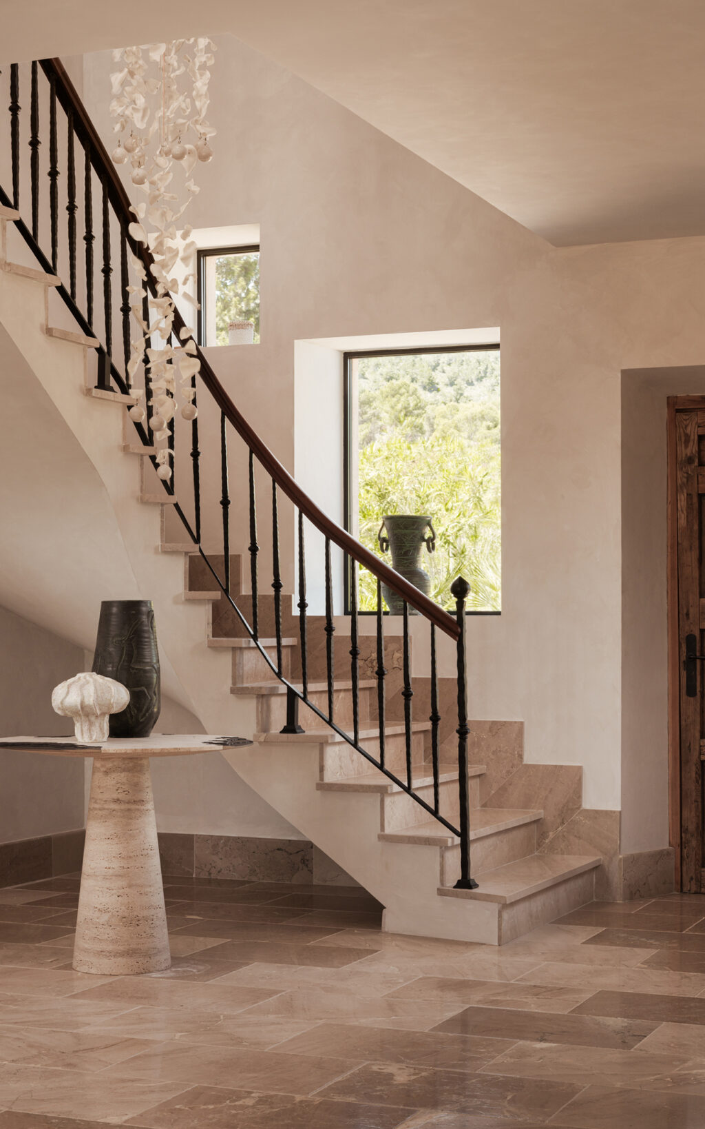 This thoughtful layering is immediately apparent in the home’s central spaces. A custom iron staircase, hand-forged by local craftsmen, rises against chalky walls; furniture forms are sculptural but never shout for attention. Lighting is curated, including standout pieces from Wired Lighting, and materials speak in whispers: weathered oak, tactile plaster, and tumbled stone.
